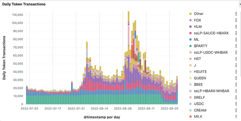 Figure 1. Daily token transactions spiked in late August / early September amid the influx of HTS tokens on the network.
