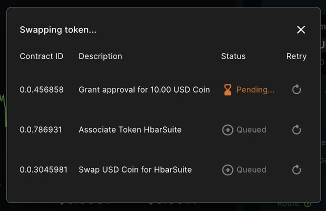SaucerSwap has introduced a new modal that provides a convenient overview of queued transactions. Let’s consider an example where a user wants to swap 10 USDC for HSUITE. If HSUITE is not yet associated, the modal will display three pending transactions in a queue: