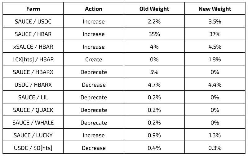 After further consideration, we have decided to achieve these common objectives by increasing the weight of emissions to the SAUCE / USDC, SAUCE / HBAR, and xSAUCE / HBAR farms, with SAUCE / USDC getting a significant boost.